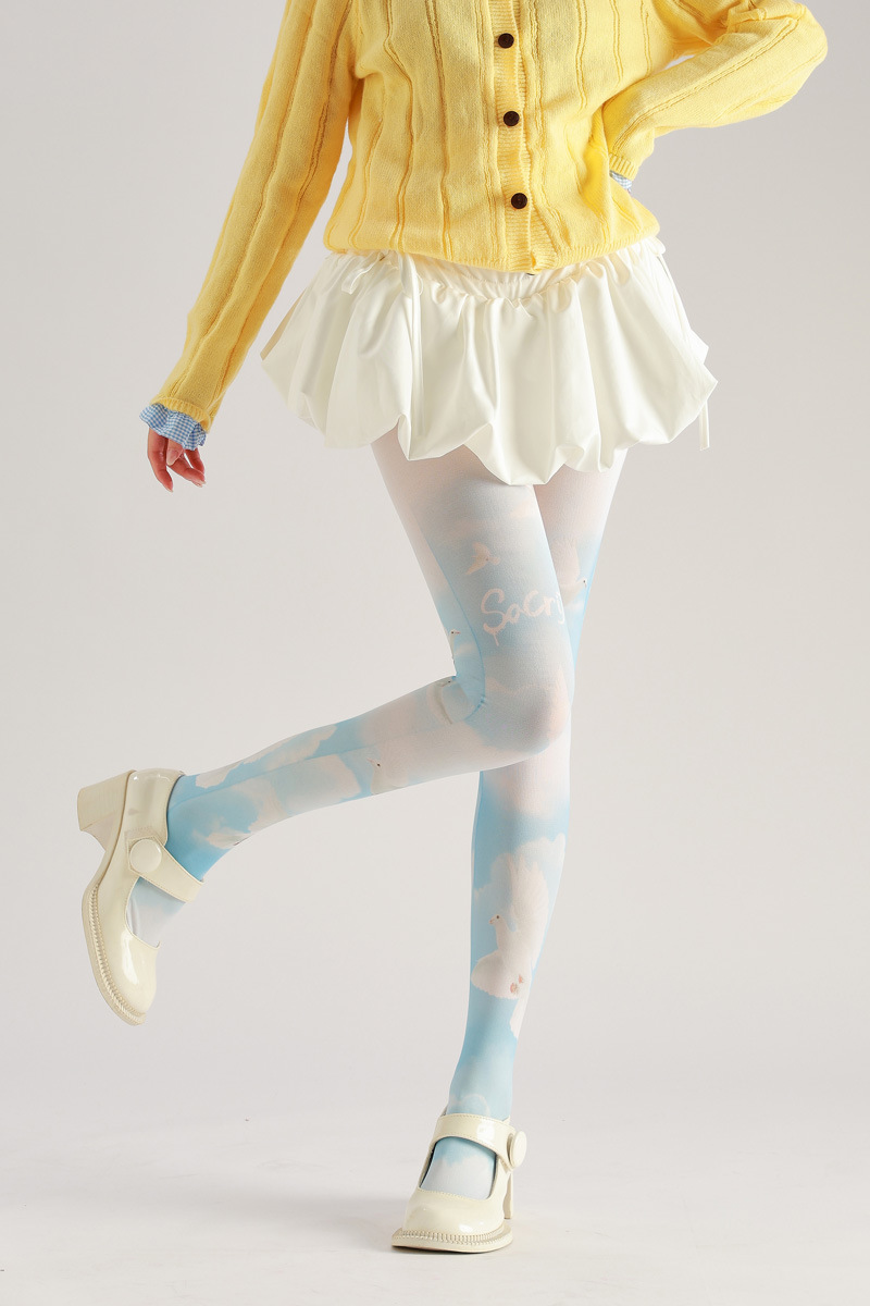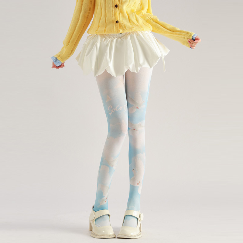 Whimsical blue sky and cloud pantyhose featuring a charming pigeon print. Elevate your outfit with a touch of playful artistry and unique style. Comfortable and eye-catching, these pantyhose are a conversation starter and a fun way to express your individuality.