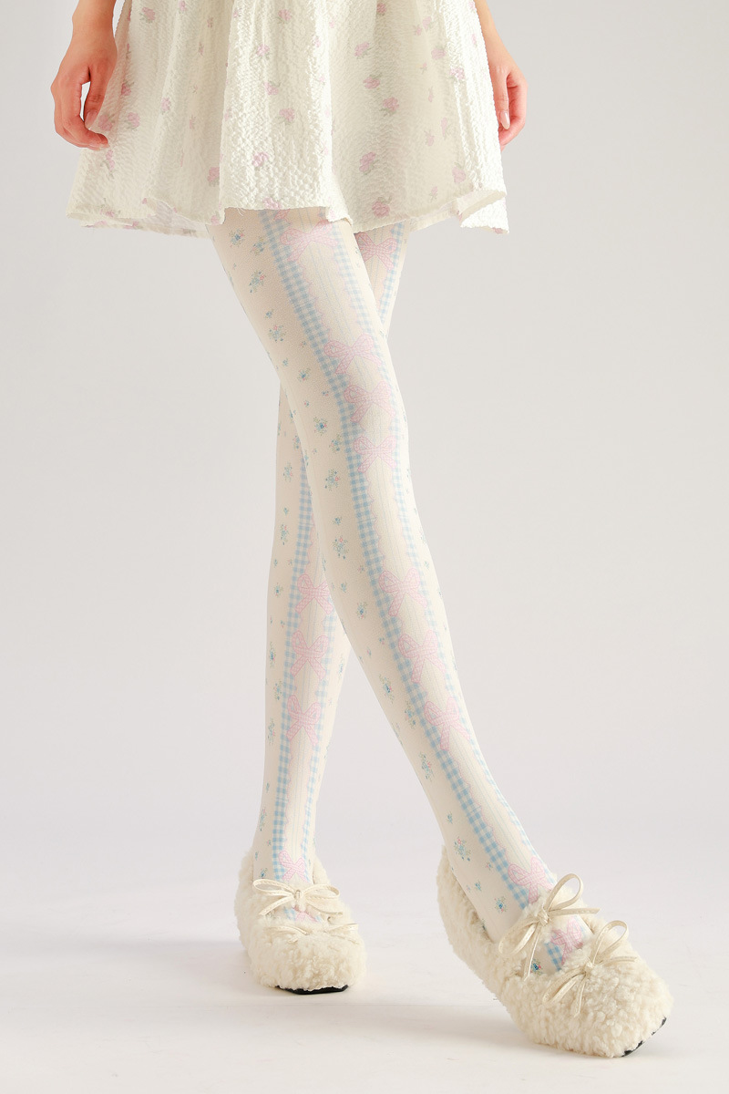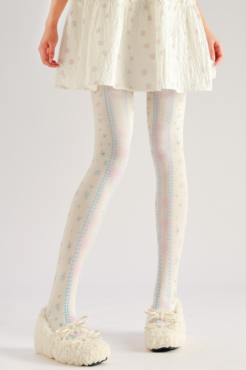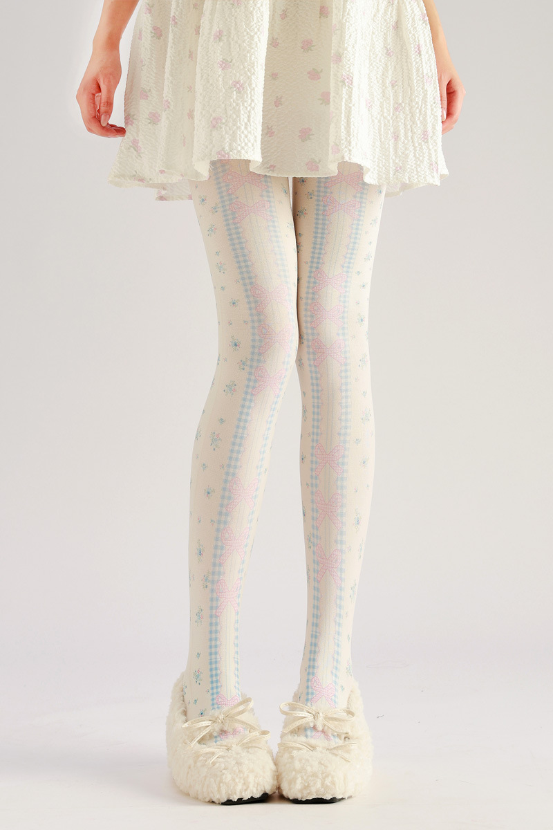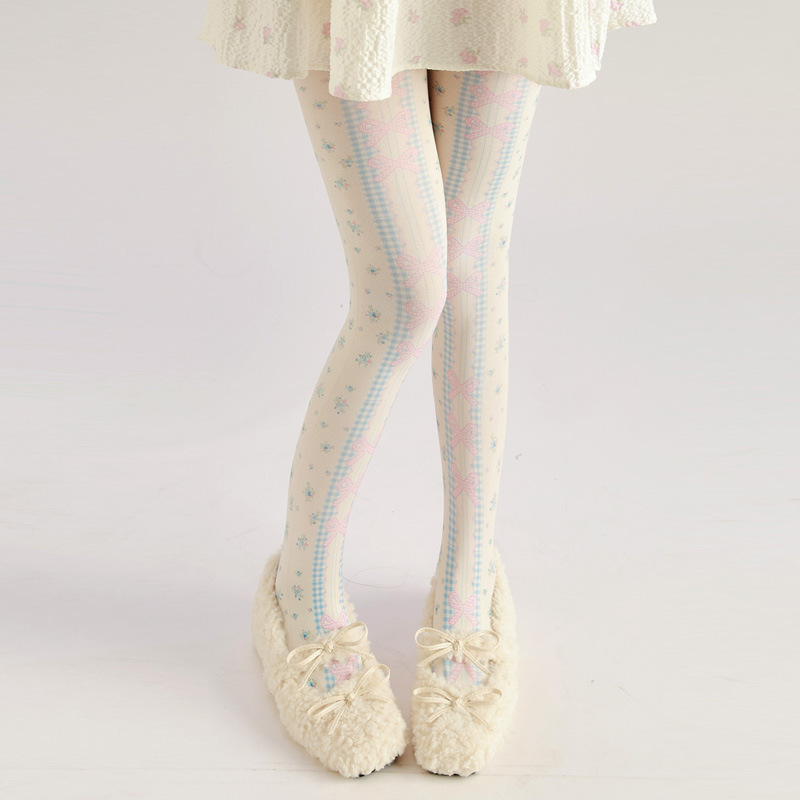 Adorable Lolita pantyhose featuring a sweet bowknot design and delicate pink floral print. Perfect for cosplay or adding a touch of kawaii to any outfit. Unique, eye-catching, and comfortable.