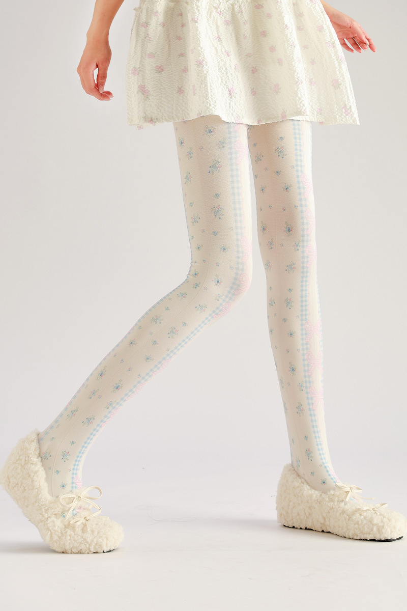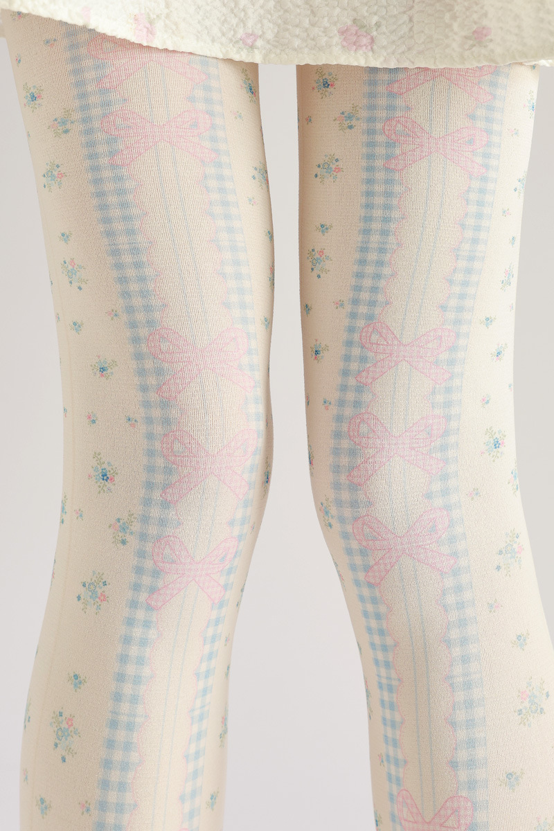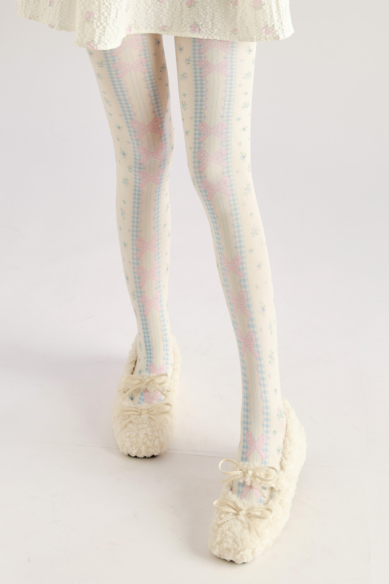Adorable Lolita pantyhose featuring a sweet bowknot design and delicate pink floral print. Perfect for cosplay or adding a touch of kawaii to any outfit. Unique, eye-catching, and comfortable.