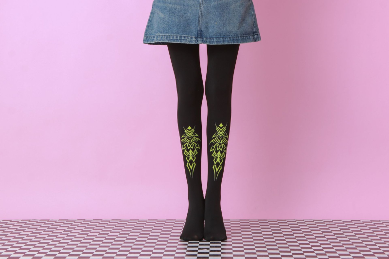 Fluorescent Green Totem Tights – Patterned Black Autumn Legwear