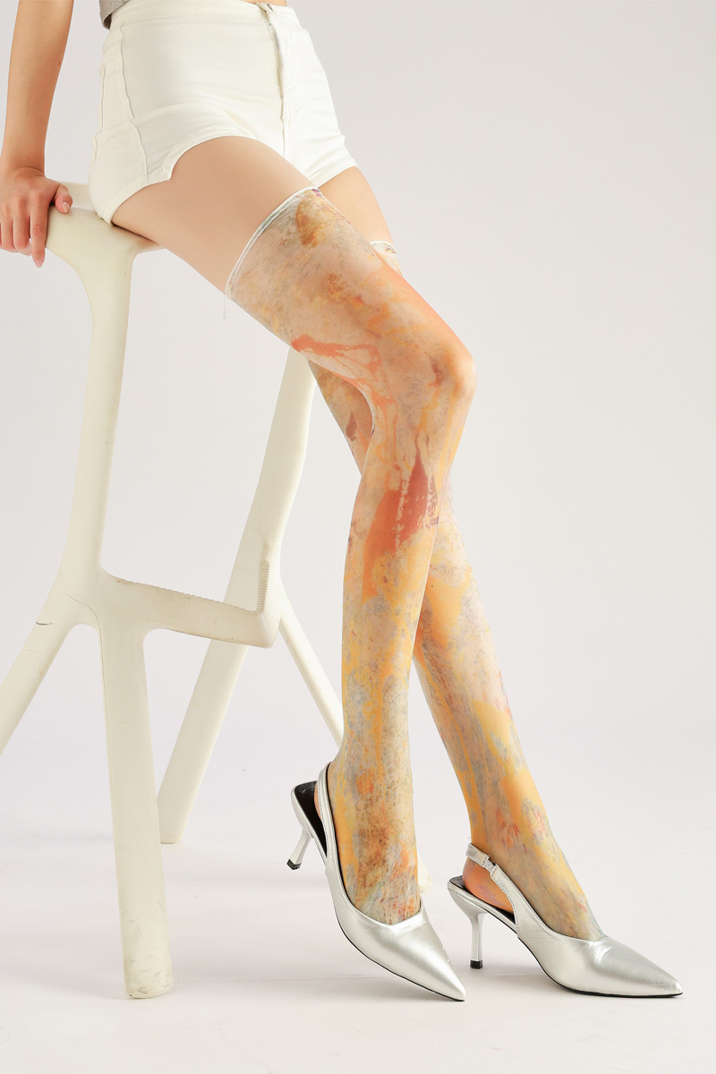 Boldly artistic and luxuriously thin, these thigh-high stockings feature a striking yellow color block print, offering a sexy and unique statement piece that elevates any outfit.